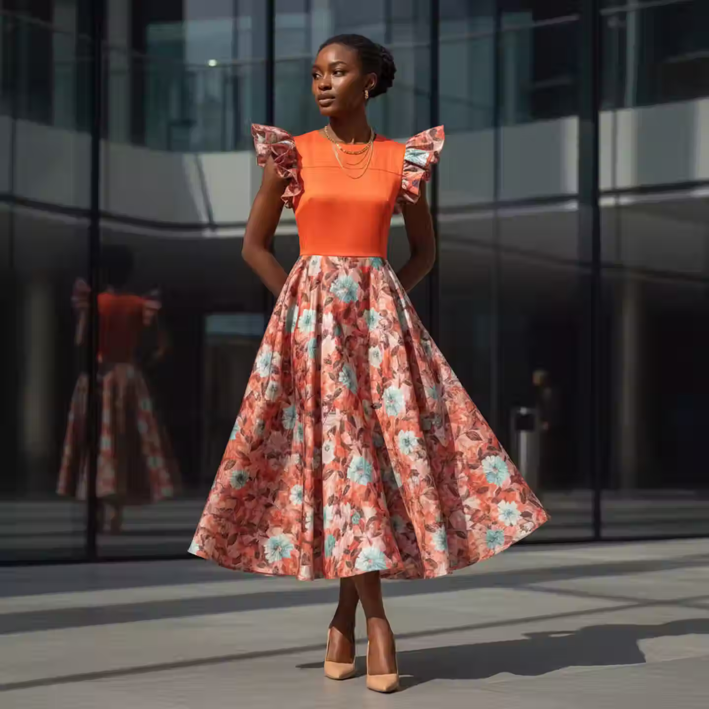 Florence dress with full circular midi skirt. Made with duchess and barbie fabrics.